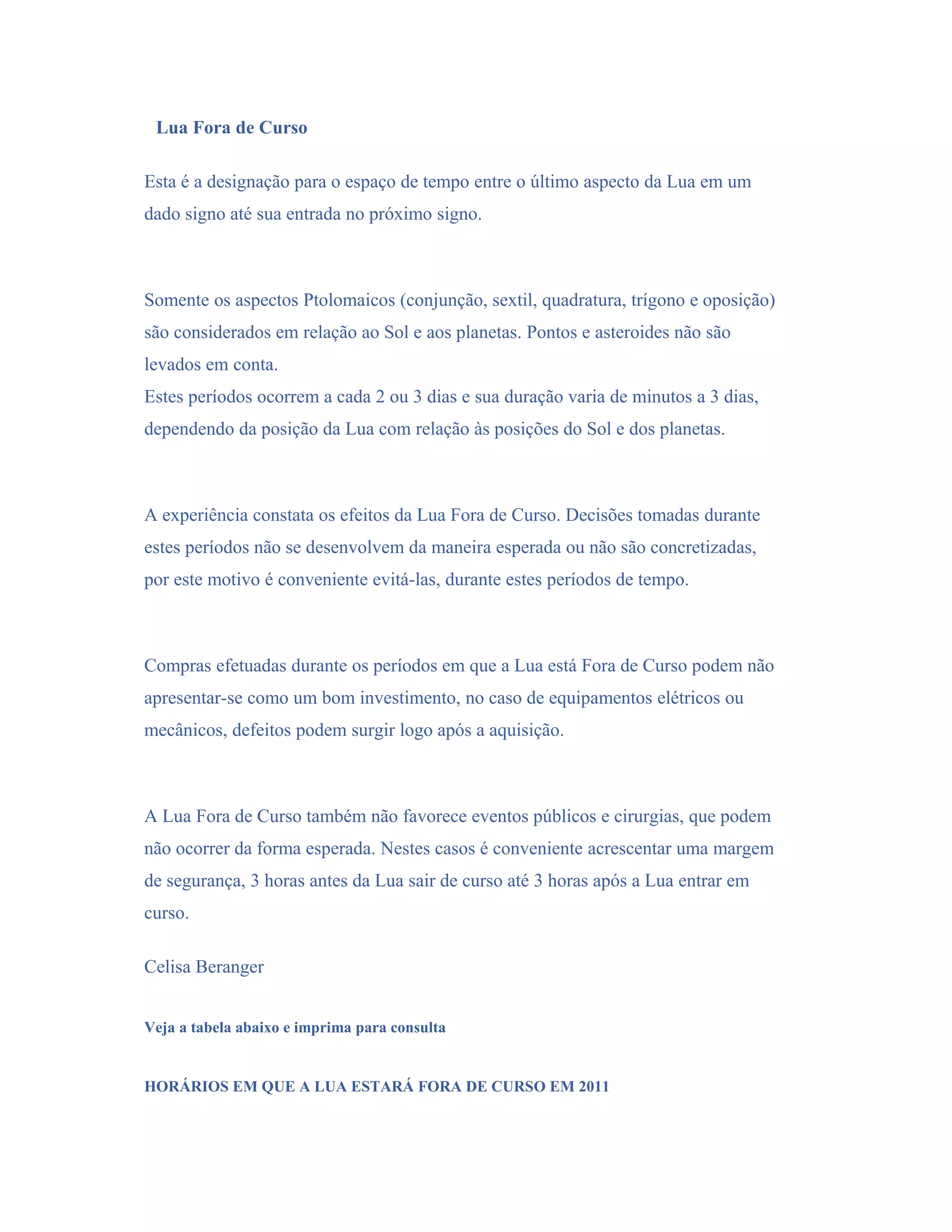 1) O documento discute o conceito de "Lua Fora de Curso", que se refere aos períodos entre a última conjunção da Lua em um signo e sua entrada no próximo signo.