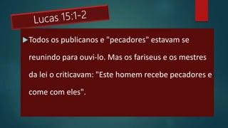 Jesus conta três parábolas sobre a alegria no céu por um pecador que se arrepende: a parábola da ovelha perdida, a parábola da moeda perdida e a parábola do filho pródigo. Cada uma destaca o amor de Deus por aqueles que se afastaram e retornam, e Sua alegria em recebê-los de volta.