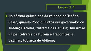O documento descreve a genealogia de Jesus desde Adão até José, marido de Maria. Relata também o ministério de pregação de João Batista, o batismo de Jesus e a descida do Espírito Santo sobre ele.