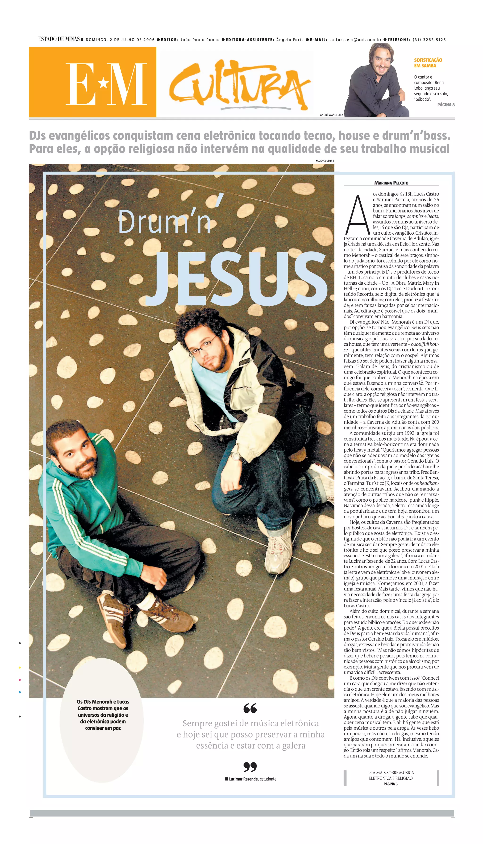 DJs evangélicos Menorah e Lucas Castro mostram que os universos da religião e da música eletrônica podem conviver em harmonia. Eles fazem parte da comunidade evangélica Caverna de Adulão e tocam em festas seculares sem misturar os dois ambientes, buscando aproximar os públicos. A comunidade surgiu em 1992 para acolher pessoas fora do padrão das igrejas tradicionais e atualmente reúne pessoas ligadas à cena eletrônica.