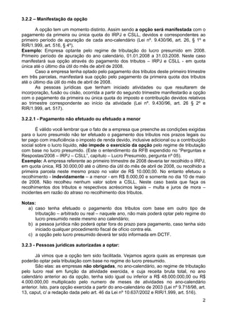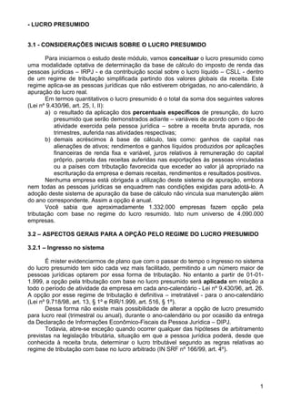 Este documento fornece uma introdução sobre o regime de tributação do lucro presumido no Brasil. Ele define lucro presumido como uma modalidade optativa de determinação da base de cálculo de impostos com base nos valores globais da receita de uma empresa. Em seguida, descreve os requisitos para optar por este regime, incluindo limites de receita bruta e como manifestar a opção anualmente.