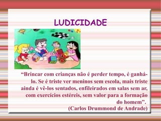 O documento discute a importância da ludicidade no desenvolvimento infantil. Ele explica que através do brincar, as crianças desenvolvem habilidades cognitivas, motoras e sociais enquanto se divertem. As atividades lúdicas estimulam a criatividade, imaginação e aprendizagem das crianças de forma espontânea e prazerosa.