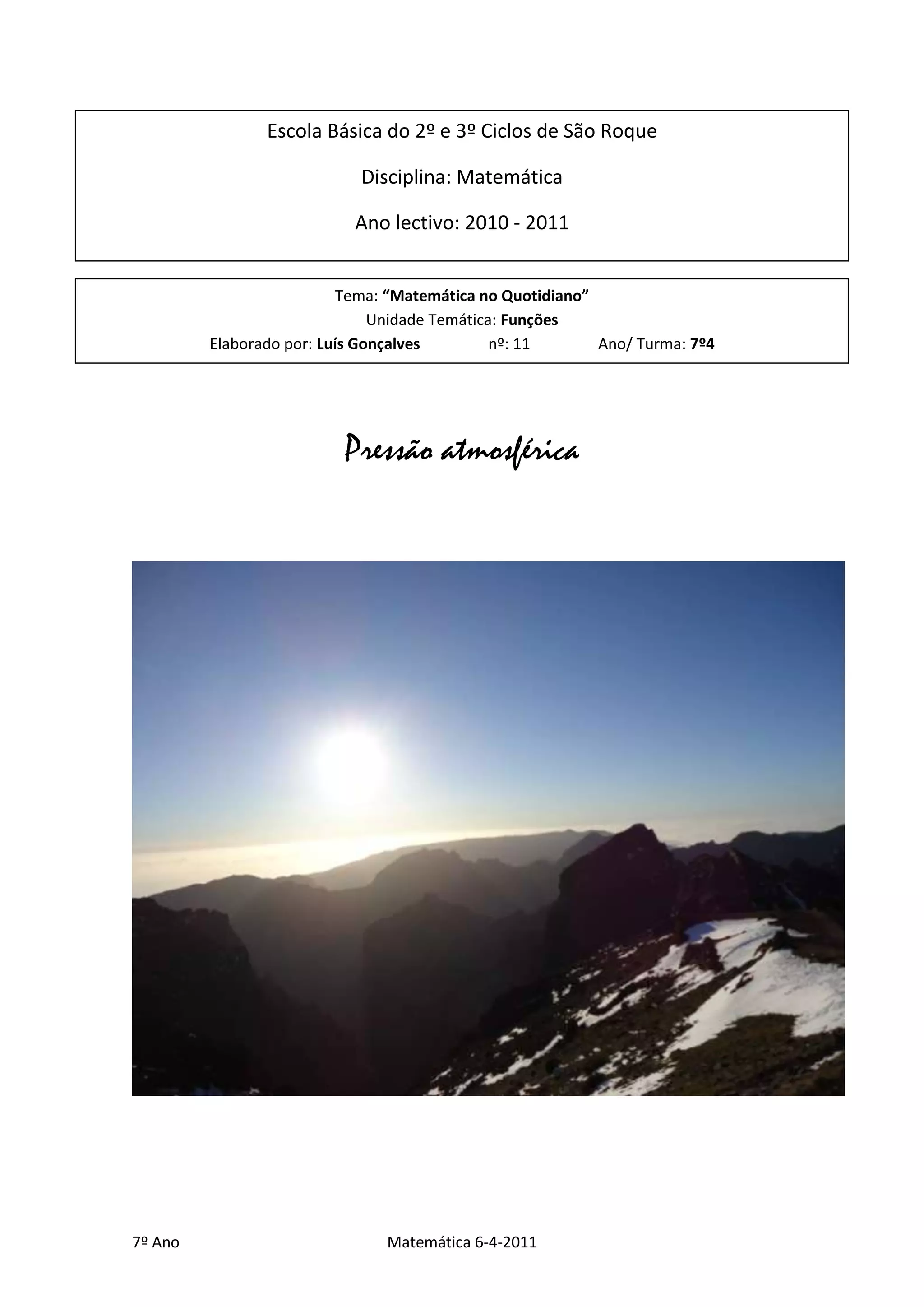 A pressão atmosférica varia em função da altitude e da temperatura, formando uma função onde cada altitude corresponde a uma única temperatura. A pressão diminui com o aumento da altitude e com a diminuição da temperatura. Fotografias foram tiradas no Poiso para ilustrar estas relações funcionais.