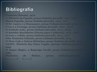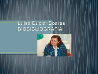 Este documento lista as obras publicadas pela autora Luísa Ducla Soares entre 1970 e 2002, incluindo poesia, prosa infantil e juvenil. Também fornece detalhes biográficos sobre a autora, como sua formação acadêmica e experiência profissional trabalhando como tradutora, jornalista e bibliotecária, além de ter publicado mais de 80 obras literárias.