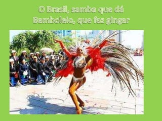 O poema descreve o Brasil como a terra amada do autor, destacando sua beleza natural com referências ao coco e à lua brincando, e sua cultura com menção ao samba e pandeiro. O autor se identifica com o Brasil e o descreve como sua terra.