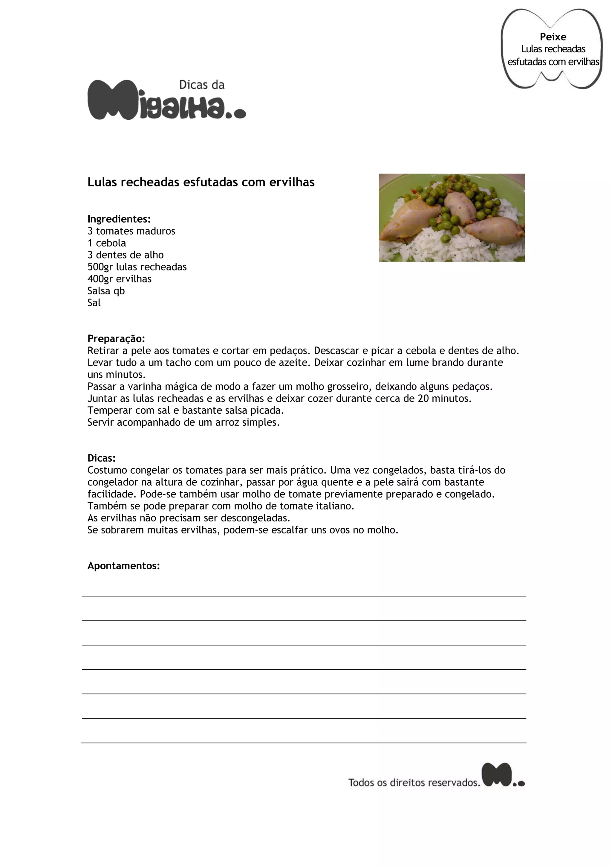 Este documento fornece uma receita para lulas recheadas esfutadas com ervilhas. Inclui instruções para preparar um molho de tomate com cebola e alho e cozinhar as lulas e ervilhas nesse molho por cerca de 20 minutos. Fornece dicas para congelar os tomates e usar ervilhas congeladas ou molho de tomate italiano.