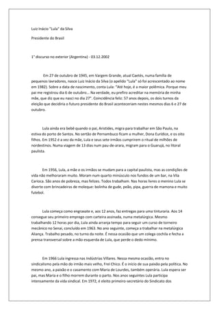 O documento descreve a trajetória de vida e carreira política de Luiz Inácio Lula da Silva, desde seu nascimento em uma família pobre no interior de Pernambuco até se tornar o primeiro presidente de esquerda eleito democraticamente no Brasil em 2002. O texto detalha a origem humilde de Lula, sua atuação como líder sindical durante a ditadura militar e a fundação do Partido dos Trabalhadores. Também aborda suas três candidaturas presidenciais anteriores de 1989, 1994 e 1998 e a vitória nas eleições