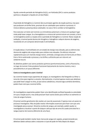 O documento descreve como o luminol é usado por investigadores para revelar traços de sangue ocultos em cenas de crime. O luminol causa uma reação química luminosa quando entra em contato com a hemoglobina no sangue. Os investigadores pulverizam a mistura de luminol em áreas suspeitas para identificar possíveis locais onde houve derramamento de sangue. O luminol pode fornecer pistas valiosas, mas outras análises são necessárias para confirmar a presença de sangue humano.