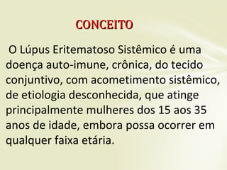 O documento resume o Lúpus Eritematoso Sistêmico, uma doença autoimune crônica que acomete principalmente mulheres jovens. É descrito o histórico da doença, epidemiologia, etiologia, manifestações clínicas que podem ocorrer em diversos órgãos, critérios diagnósticos, exames complementares e opções de tratamento médico e não médico.