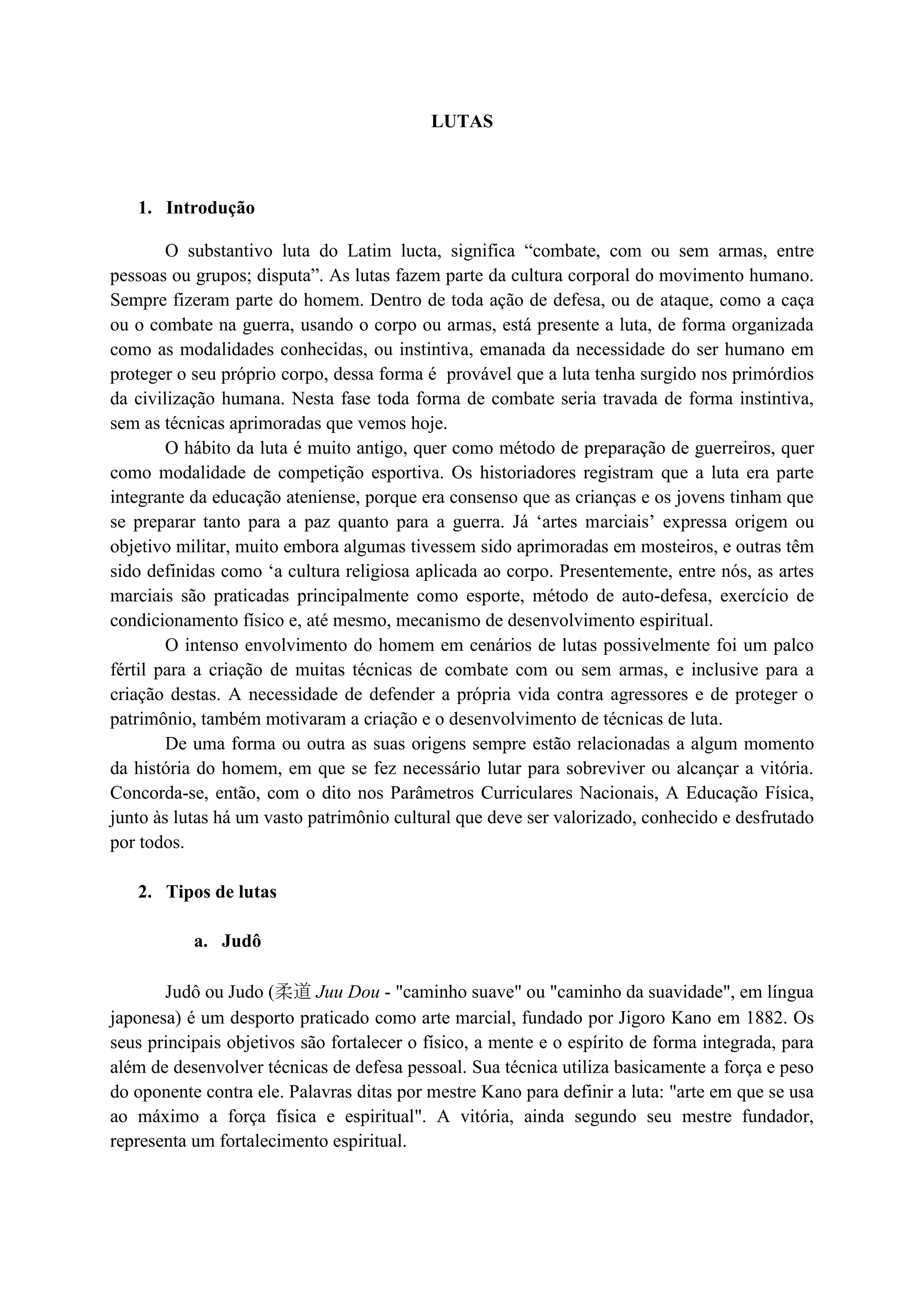 O documento discute as origens e tipos de lutas. Apresenta as principais modalidades como judô, muay thai, kung fu, jiu-jitsu e caratê. Destaca a importância das lutas na Educação Física por melhorar a saúde física e mental dos alunos e despertar interesse nas aulas. Relata que as lutas surgiram nos primórdios da humanidade para defesa e sobrevivência.