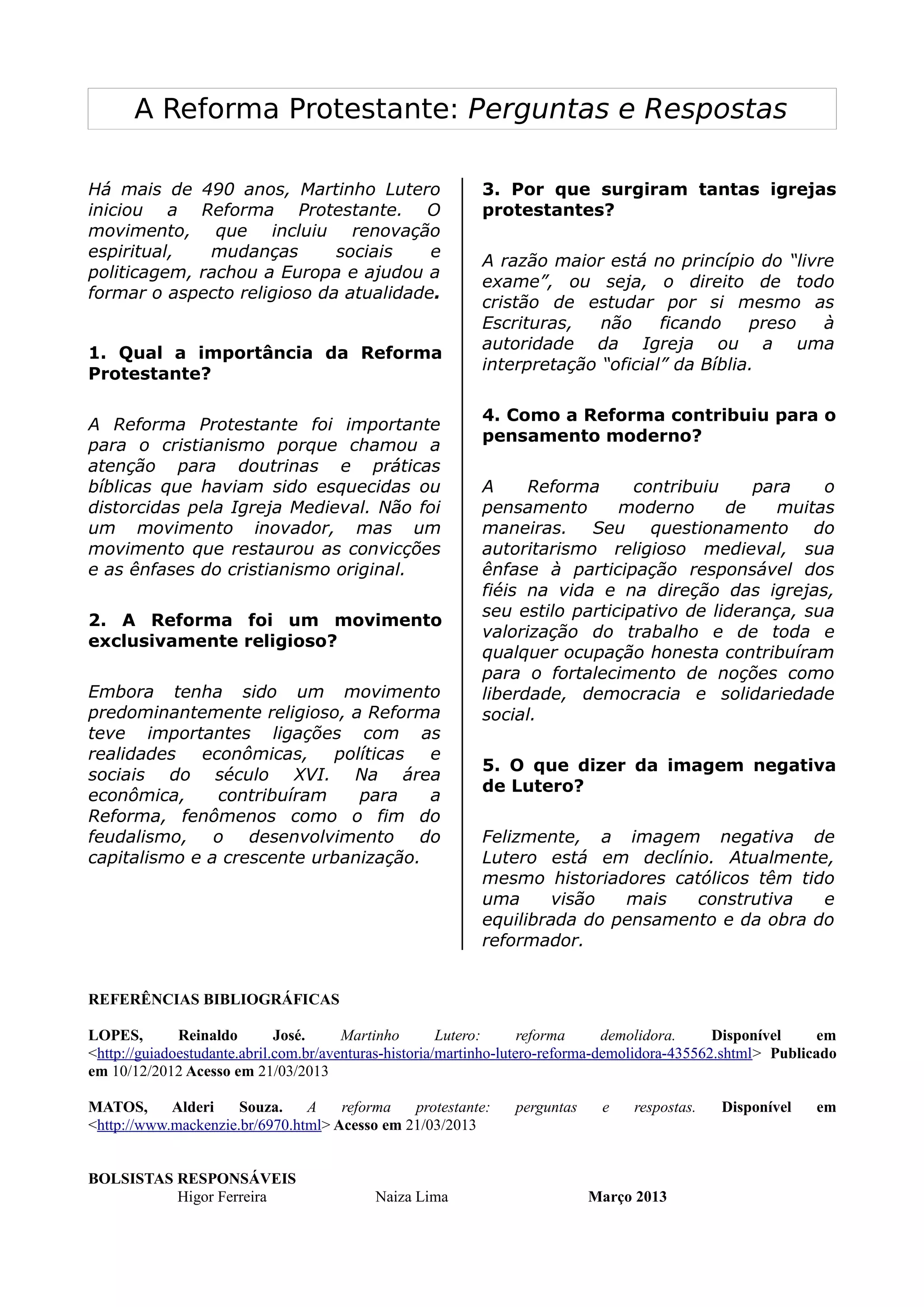 A Reforma Protestante começou há mais de 490 anos quando Martinho Lutero questionou doutrinas e práticas da Igreja Católica. Embora predominantemente religioso, o movimento também teve impactos econômicos e políticos. O princípio do "livre exame" das escrituras levou à formação de muitas igrejas protestantes, e a Reforma contribuiu para o pensamento moderno enfatizando a liberdade e participação.