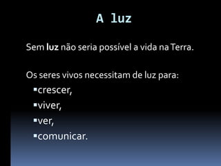 A luz é essencial para a vida na Terra e os seres vivos dependem dela para crescer, viver, ver e se comunicar. A luz se propaga através de ondas eletromagnéticas e pode ser natural, como a luz solar, ou artificial, como luz de lâmpadas. Diferentes materiais podem ser transparentes, translúcidos ou opacos à luz.