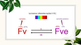 O documento discute como a luz afeta o desenvolvimento vegetal, mencionando o fotocromo, um pigmento envolvido na germinação de sementes e florescimento. Explica que o fotocromo é uma proteína que pode estar nas formas ativa (Fve) ou inativa (Fv) e que a conversão entre essas formas é afetada pela luz. Também discute o fotoblastismo, ou efeito da luz na germinação, que pode ser positivo, negativo ou indiferente.