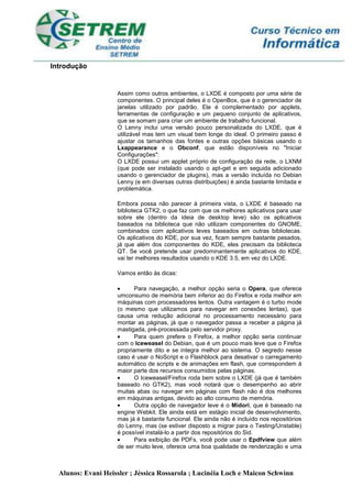 O LXDE é um ambiente de trabalho leve para Linux composto por aplicativos independentes como o Openbox, PCManFM e Leafpad. Ele usa poucos recursos, é personalizável e fornece uma interface agradável. O documento lista aplicativos alternativos leves para navegação, edição, mídia e outros usos que funcionam bem no LXDE.