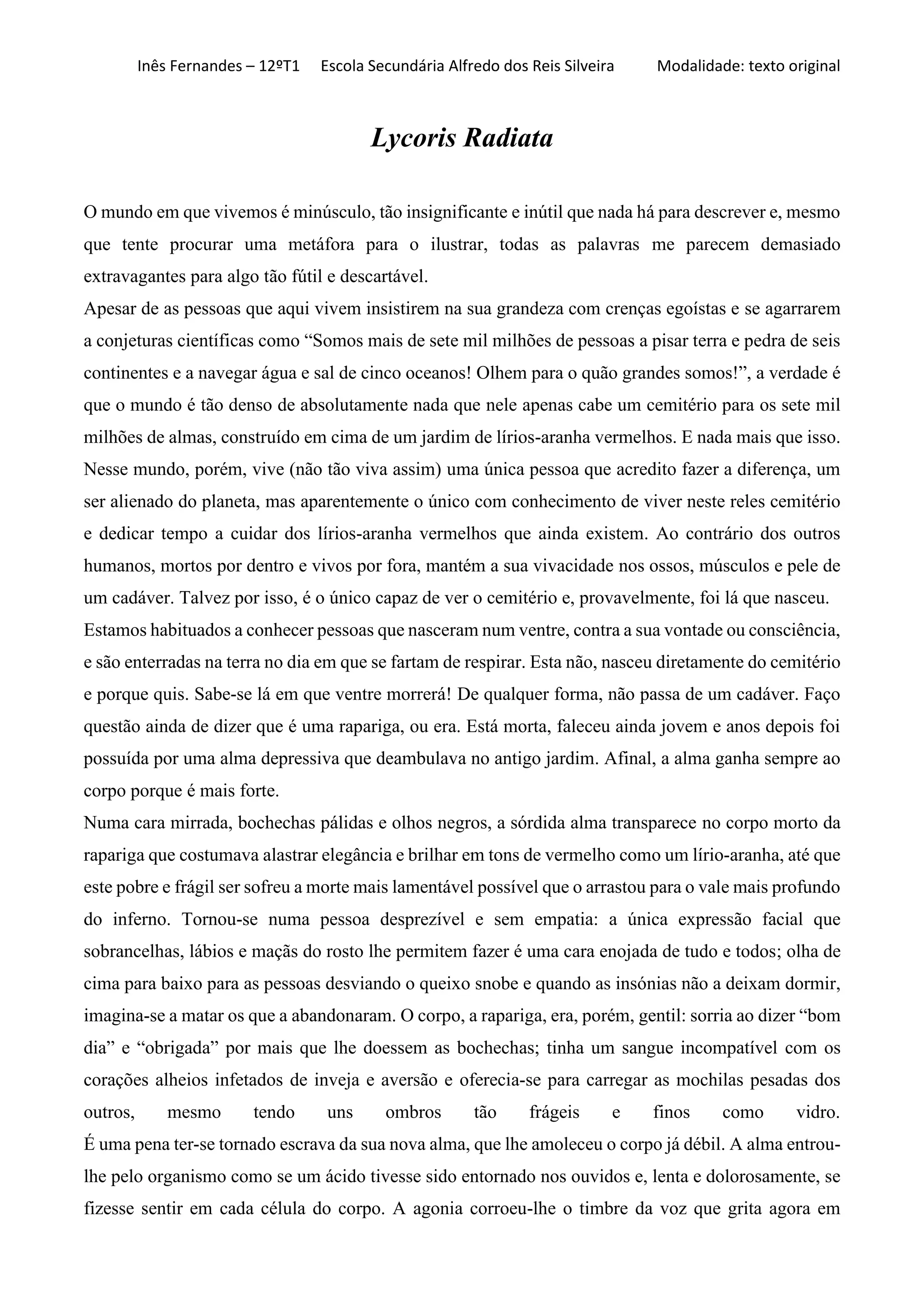 O texto explora a insignificância do mundo e a dualidade entre a vida e a morte através da figura de uma rapariga possuída por uma alma amarga que a transformou em um ser detestável. A narrativa reflete sobre a luta interna desta alma, que, apesar de sua aparência arrogante, é uma vítima de sua própria realidade e da dor que carrega. A metáfora dos lírios-aranha simboliza a beleza destruída e a solidão em um mundo dominado pela futilidade humana.