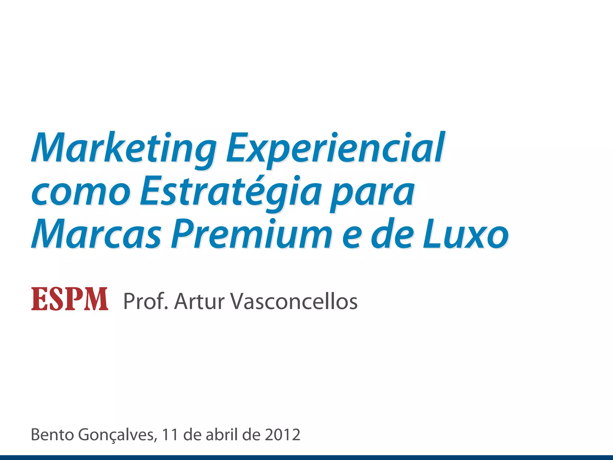 O documento discute marketing experiencial como estratégia para marcas premium e de luxo. Ele aborda conceitos como branding, entendimento do mercado de luxo e exemplos de ações experienciais realizadas por marcas.