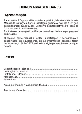 [1] O documento fornece instruções para instalação, uso e manutenção de uma banheira de hidromassagem da marca Banus; [2] Inclui especificações técnicas do produto, detalhes sobre a instalação elétrica, hidráulica e do sistema de aquecimento; [3] Também fornece dicas sobre cuidados na instalação, uso e manutenção para garantir o bom funcionamento e conservação do produto.