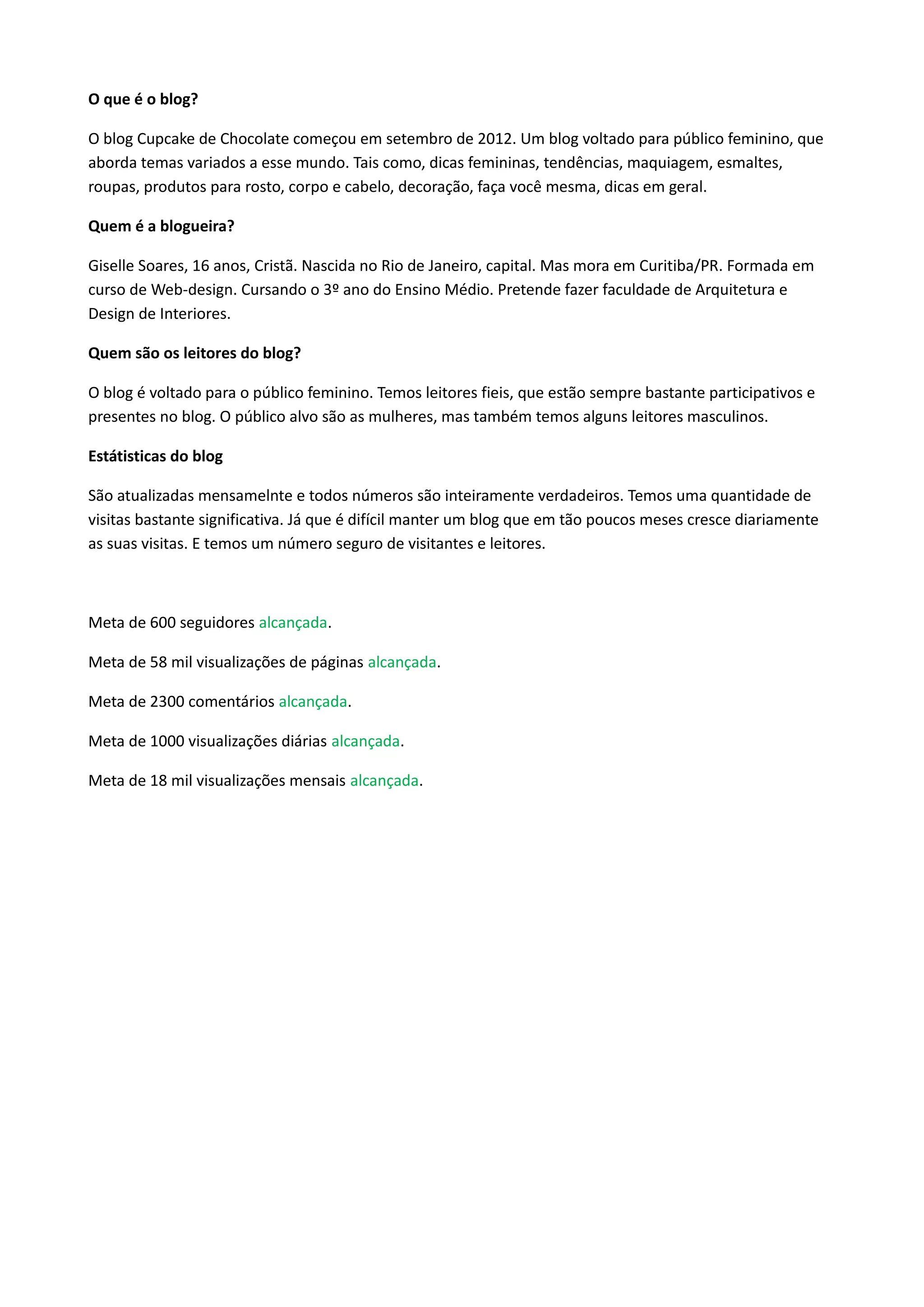 O blog Cupcake de Chocolate começou em 2012 e aborda temas femininos como maquiagem, moda e decoração. É escrito por Giselle Soares, uma estudante de 16 anos de Curitiba, e tem como público-alvo principalmente mulheres. O blog atingiu várias metas de visualizações e seguidores e oferece anúncios como banners, posts patrocinados e sorteios para divulgar empresas.