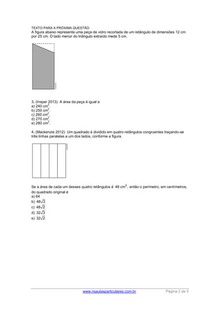 O documento apresenta 6 problemas que envolvem cálculo de áreas de figuras planas geométricas como retângulos, triângulos e polígonos. As questões abordam tópicos como determinar a área total de figuras formadas pela união de outras figuras, calcular a área que falta ou sobra após retirar partes de figuras e identificar a área de polígonos irregulares a partir de malhas quadriculadas.