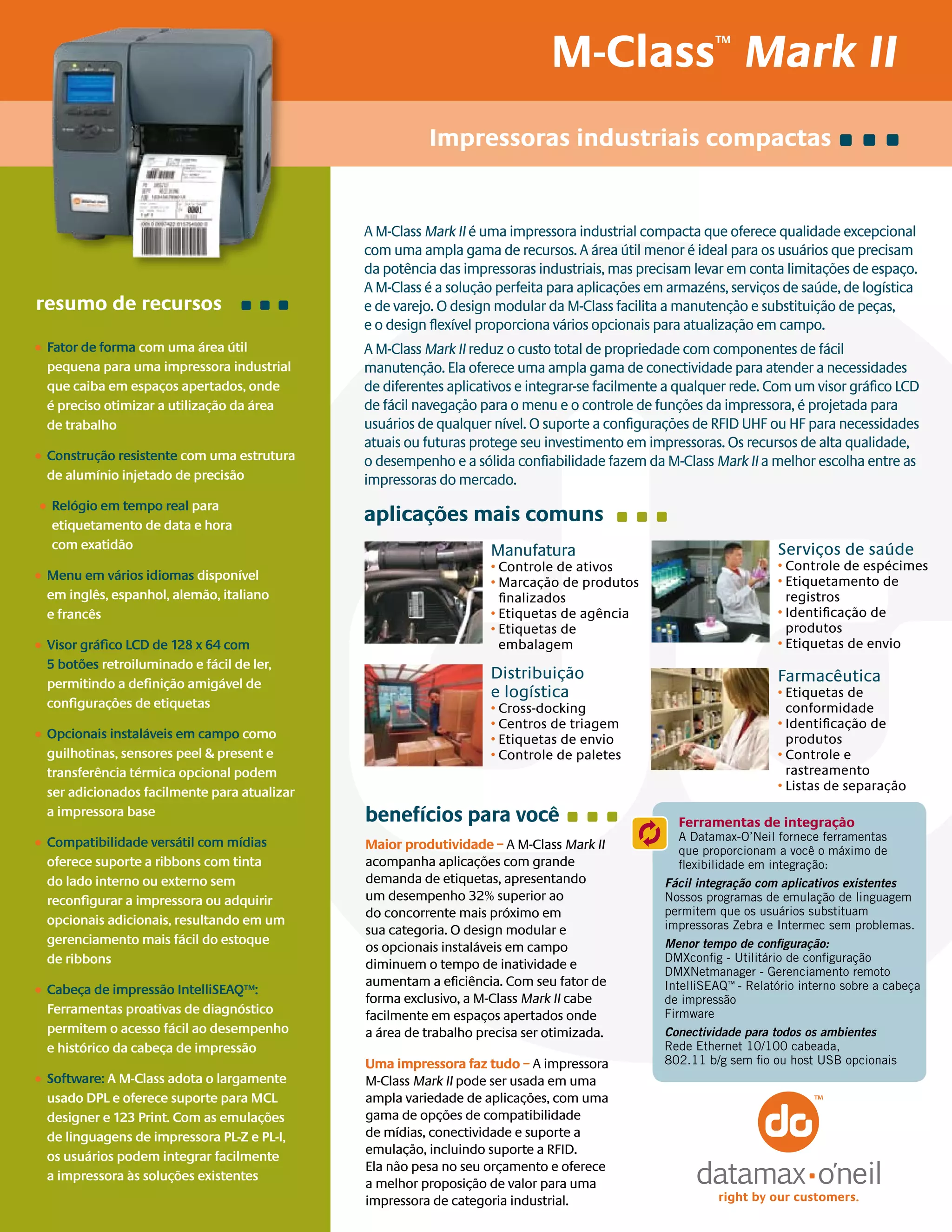 O documento descreve as características e especificações de três modelos de impressoras industriais da linha M-Class Mark II da Datamax-O'Neil - os modelos M-4206, M-4210 e M-4308. As impressoras oferecem alta qualidade de impressão, desempenho e confiabilidade para aplicações em manufatura, logística, saúde e farmacêutica. As impressoras variam em velocidade de impressão, resolução e suporte a RFID.