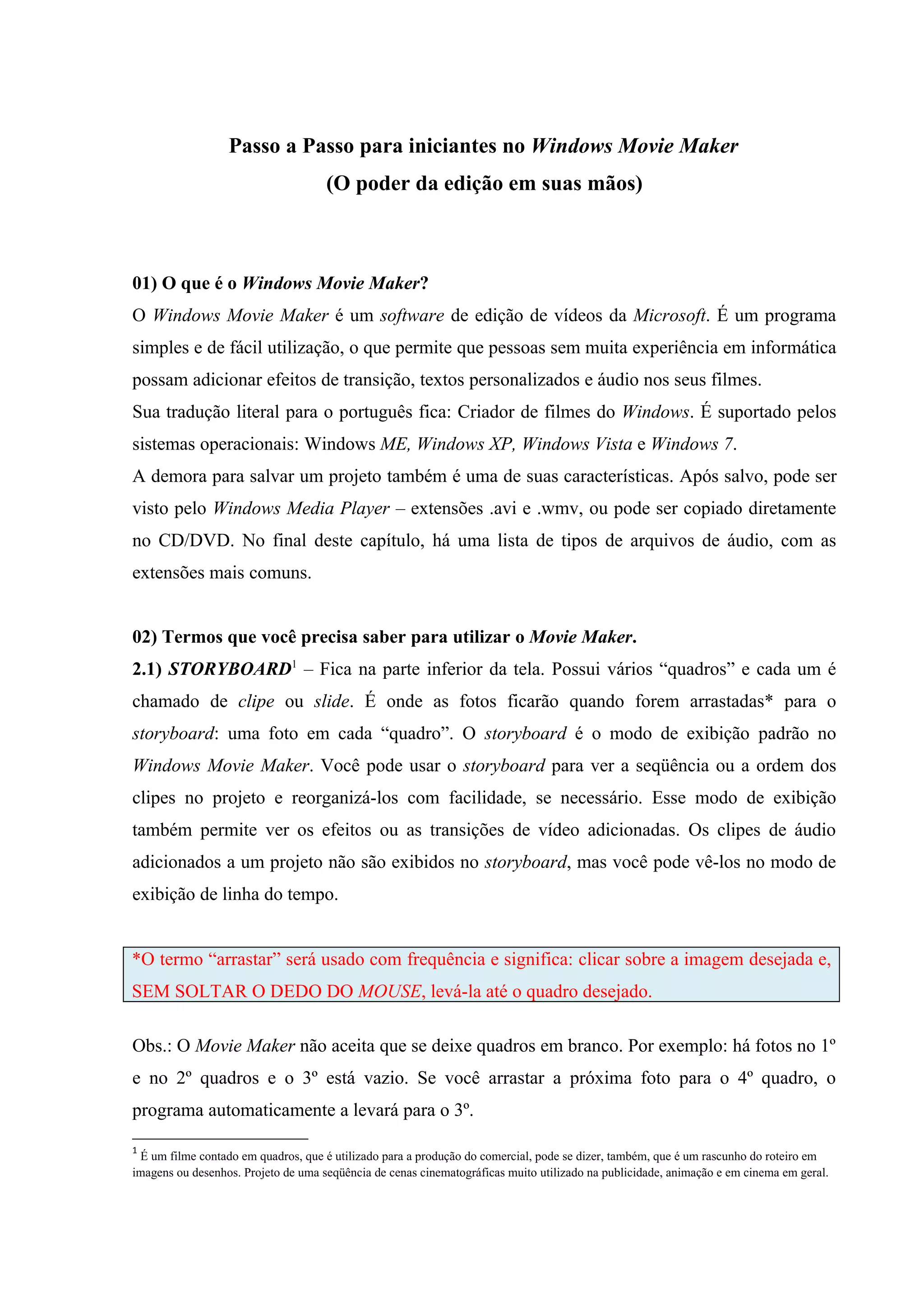 Este documento fornece instruções passo a passo sobre como usar o Windows Movie Maker para editar vídeos de forma simples. Ele explica como importar mídia, organizá-la no storyboard, adicionar efeitos, títulos e música, e salvar o projeto finalizado.