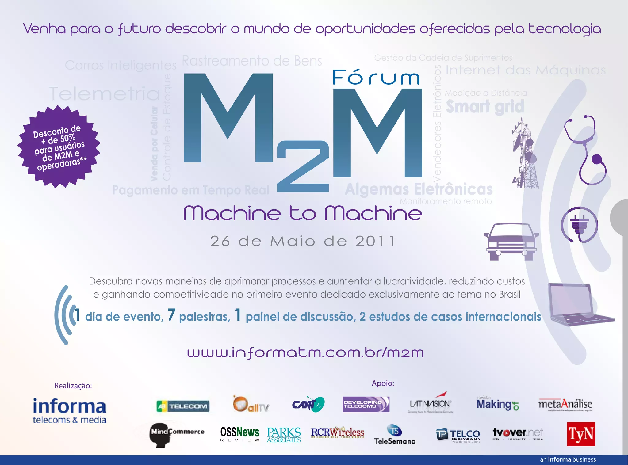 Este documento apresenta um evento sobre tecnologia Machine-to-Machine (M2M) que ocorrerá em 26 de maio de 2011 em São Paulo. O evento contará com palestras sobre: (1) introdução à tecnologia M2M e casos de sucesso no Brasil, (2) desenvolvimento de planos de negócios para investimentos em M2M, (3) aplicações de M2M em carros inteligentes, energia, finanças e transportes/segurança, além de (4) painéis sobre estratégias de mercado para operadoras
