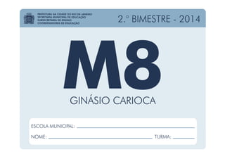 Este documento apresenta o plano de ensino de Matemática para o 8o ano do 2o bimestre de 2014 na cidade do Rio de Janeiro, contendo os tópicos a serem abordados como números racionais, expressões algébricas e geometria plana.