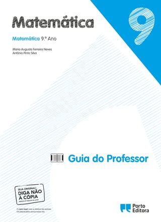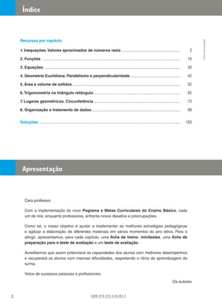 1. O documento apresenta um guia do professor para o 9o ano de matemática, organizado por capítulos com recursos como fichas de treino, minitestes e testes de avaliação.