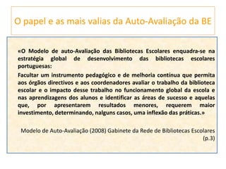 O documento discute o modelo de auto-avaliação para bibliotecas escolares em Portugal. O modelo visa avaliar o trabalho da biblioteca e seu impacto na escola através de domínios como apoio curricular, leitura, projetos e gestão. A aplicação do modelo requer envolvimento da escola e comunicação com professores, alunos e administração para identificar pontos fortes, fracos e melhorias.