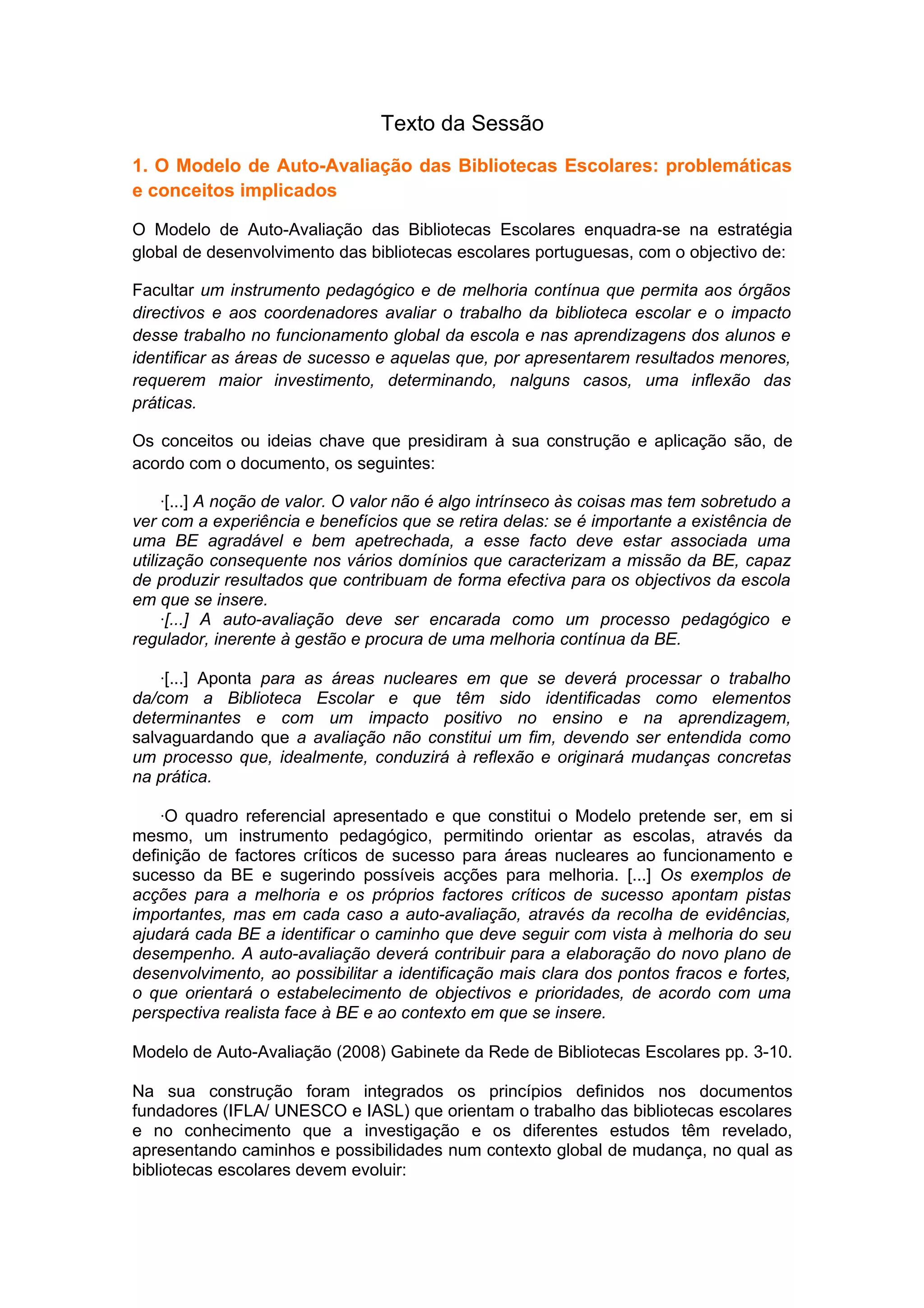 Este documento discute o Modelo de Auto-Avaliação das Bibliotecas Escolares Portuguesas, que visa fornecer às escolas uma ferramenta para avaliar o trabalho da biblioteca e identificar áreas de sucesso e melhoria. O modelo baseia-se em conceitos-chave como a noção de valor, auto-avaliação como processo de melhoria contínua, e áreas nucleares de impacto na aprendizagem. O documento também discute conceitos como evidence-based practice e pesquisa-ação na avaliação de bibliotecas.