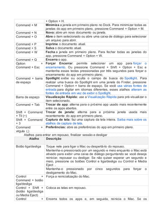 Este documento lista atalhos de teclado comuns no Mac, incluindo atalhos para cortar, copiar e colar; navegar e selecionar texto; abrir aplicativos e documentos; e alternar entre janelas e aplicativos. Ele também fornece atalhos para entrar em repouso, fechar sessão e desligar o Mac.
