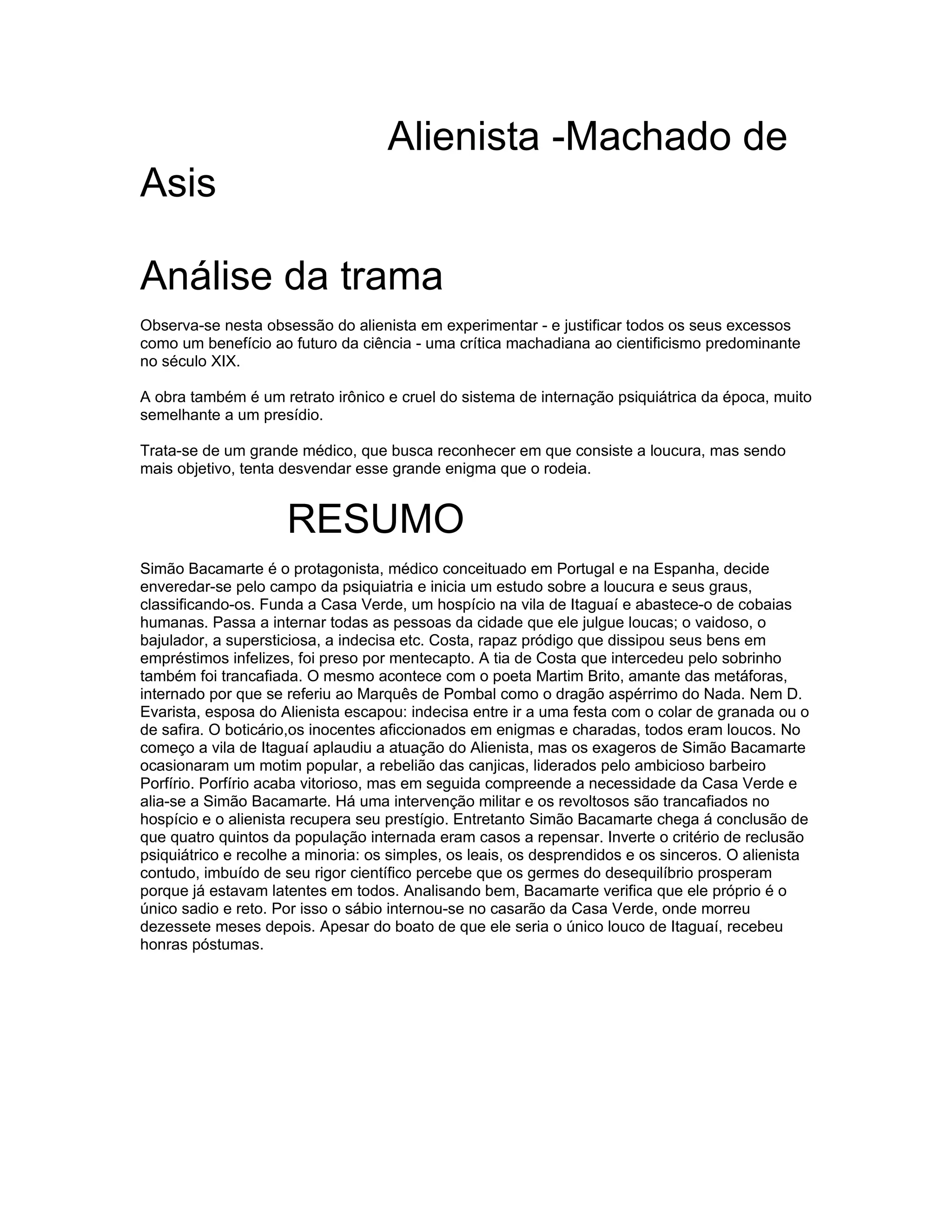 Simão Bacamarte, um médico conceituado, funda um hospício chamado Casa Verde e começa a internar todos os moradores da cidade que ele julga "loucos", incluindo aqueles que são vaidosos, indecisos ou supersticiosos. Isso causa um levante popular liderado pelo barbeiro Porfírio, mas Bacamarte recupera seu prestígio com a ajuda de militares. No final, ele percebe que a maioria dos pacientes na verdade não são loucos e ele próprio pode ser o único doente mental.