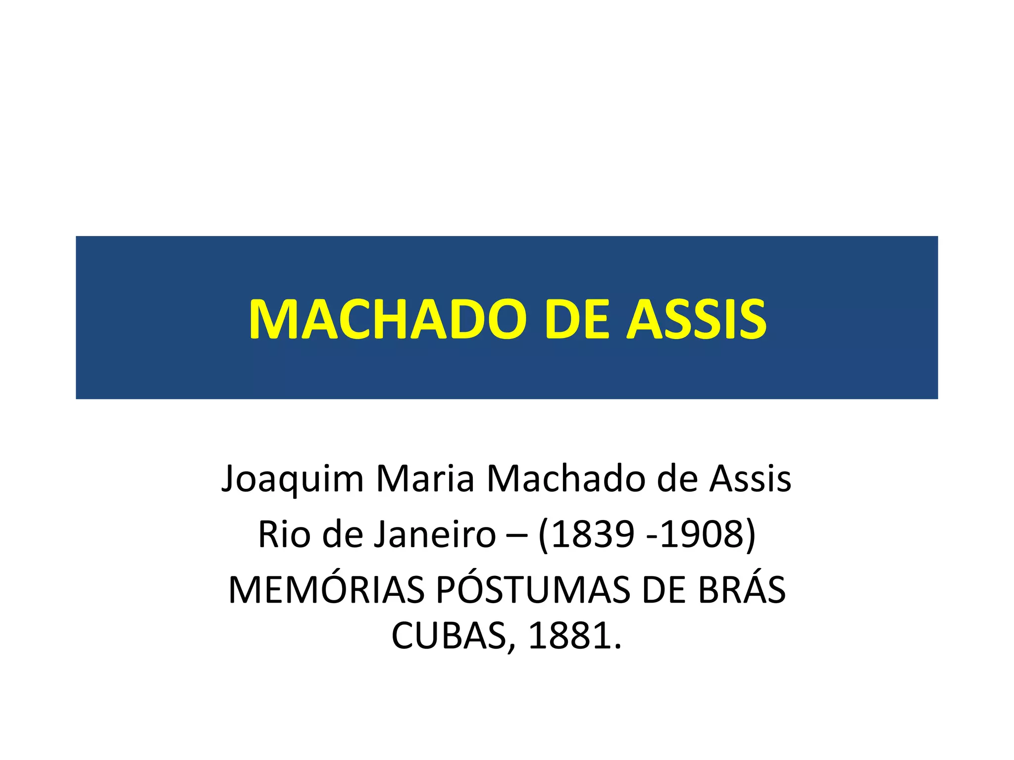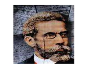 1) O documento descreve a vida e obra do escritor brasileiro Machado de Assis. 2) Machado de Assis dividiu sua carreira literária em duas fases, a romântica e a realista. 3) A narrativa analisa as principais características estilísticas e temáticas da obra de Machado de Assis, como o uso da ironia e a análise psicológica profunda dos personagens.