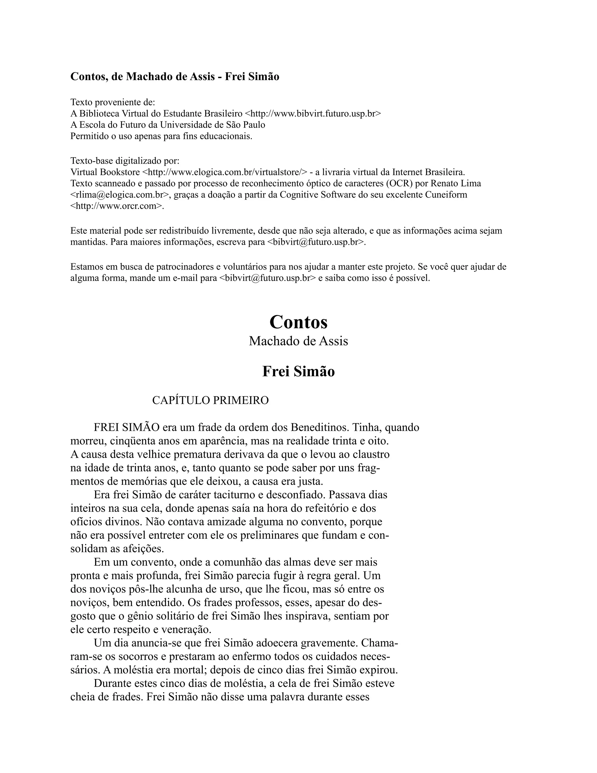 Este documento é um resumo do conto "Frei Simão", de Machado de Assis. O conto narra a história de Simão, que se apaixona por sua prima Helena. Porém, seus pais egoístas o enviam para longe para impedir o relacionamento. Mesmo separados, Simão e Helena mantêm contato por cartas. Quando a tia de Helena descobre as cartas, proíbe a comunicação entre eles. Simão recebe então uma carta do pai dizendo que Helena morreu. Abalado, Simão decide ent