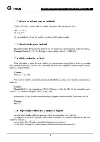 O documento descreve funções de macros e variáveis em programas CNC, incluindo 1) como variáveis podem armazenar dados e valores para uso em expressões matemáticas e lógicas, 2) os tipos de variáveis e suas finalidades, e 3) como comandos como IF e WHILE permitem desvios condicionais e repetições no fluxo do programa.