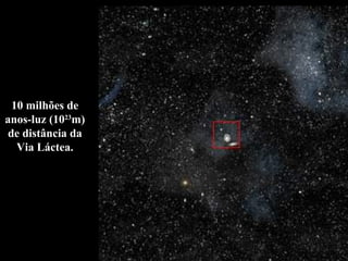 Este documento descreve uma viagem através de escalas de distância, começando a 10 milhões de anos-luz da Via Láctea e terminando a 10-16 metros, examinando partículas subatômicas. Ele fornece descrições de como objetos celestes e estruturas aparecem à medida que nos aproximamos, desde galáxias até células e partículas individuais.
