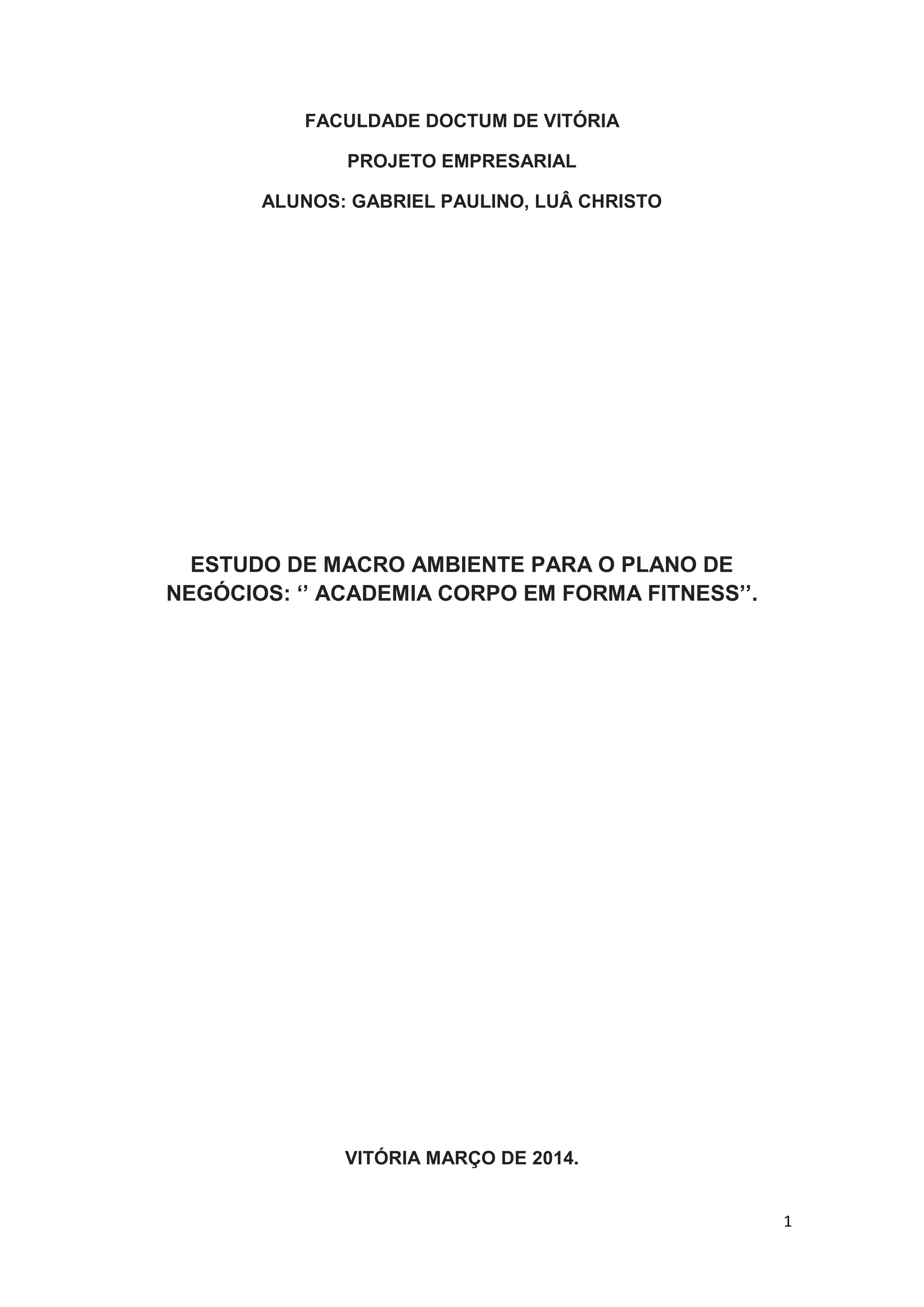 O documento descreve o macroambiente de uma academia de ginástica em Vitória, Brasil. Ele analisa as variáveis demográficas, econômicas, sócio-culturais, político-jurídicas e tecnológicas que afetam o desempenho do negócio, incluindo o crescimento populacional local, o crescimento do consumo brasileiro, hábitos de vida sedentários da população, regulamentações do setor e novas tecnologias de equipamentos e roupas para fitness.
