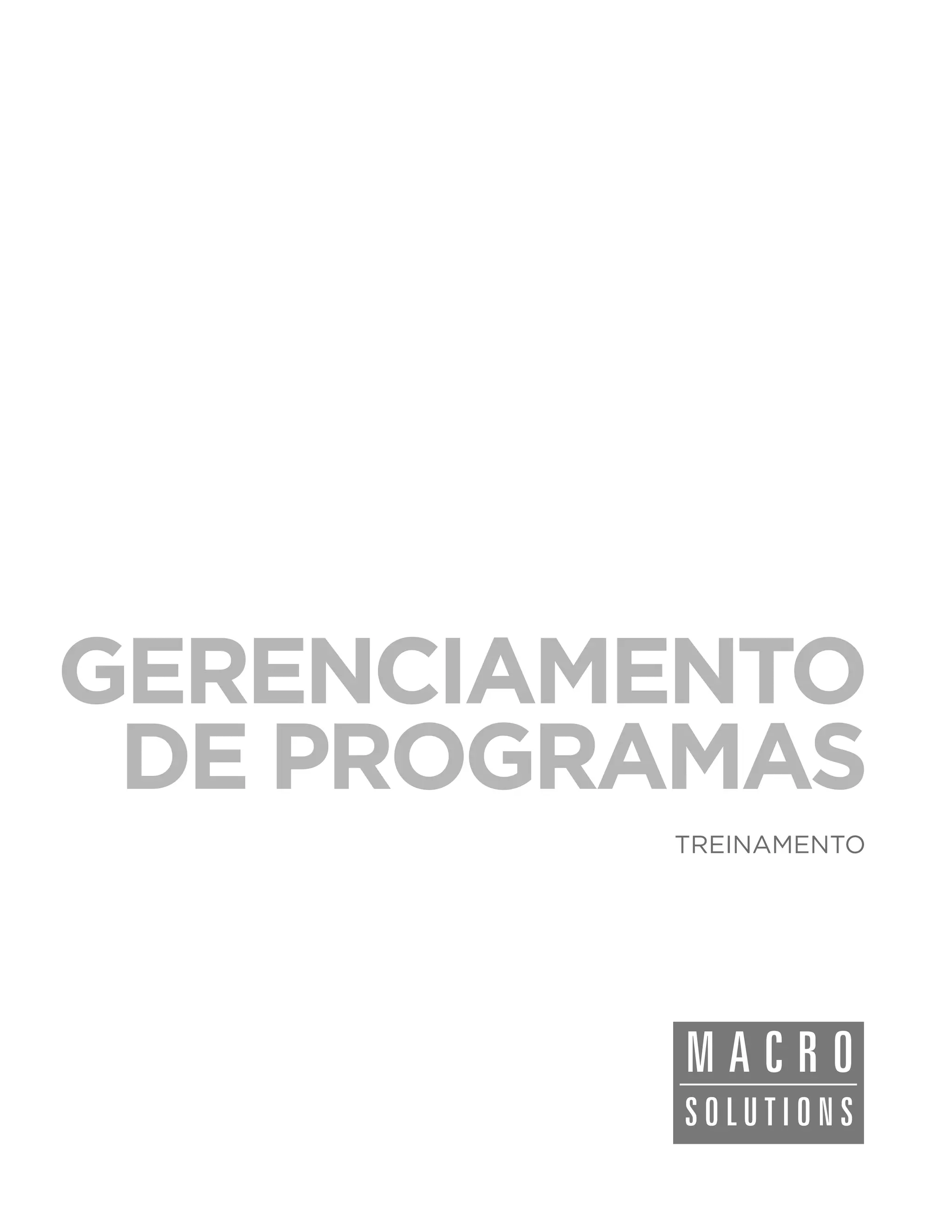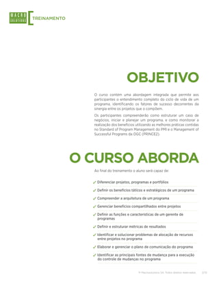 Este documento fornece um resumo de um curso de treinamento em gerenciamento de programas. O curso aborda conceitos como ciclo de vida do programa, iniciação, planejamento, execução, monitoramento e encerramento de programas. Inclui também dinâmicas como estudos de caso e trabalhos em grupo para reforçar os conceitos aprendidos.