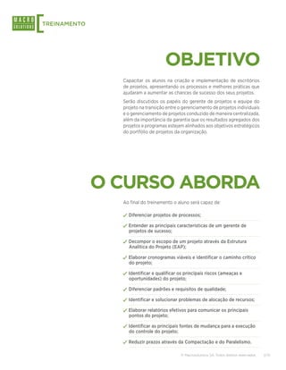 O documento fornece um resumo do treinamento "PMO - Project Management Office". O treinamento tem como objetivo capacitar os alunos na criação e implementação de escritórios de projetos, apresentando processos e melhores práticas. O curso aborda tópicos como diferenciação de projetos e processos, características de um gerente de projetos de sucesso, elaboração de cronogramas e identificação de riscos. Inclui também dinâmicas e exercícios em grupo para demonstrar conceitos na prática.