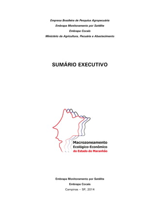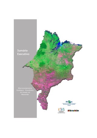 Este documento resume o relatório executivo do zoneamento ecológico-econômico do estado do Maranhão, realizado pela Embrapa. O zoneamento mapeou as zonas e subzonas do estado com base em diagnósticos físico, biótico, socioeconômico e jurídico, e traçou cenários futuros para orientar o planejamento territorial sustentável. O processo envolveu reuniões, consultas públicas e validação dos atores locais para integrar os interesses da sociedade na gestão do território maranhense.