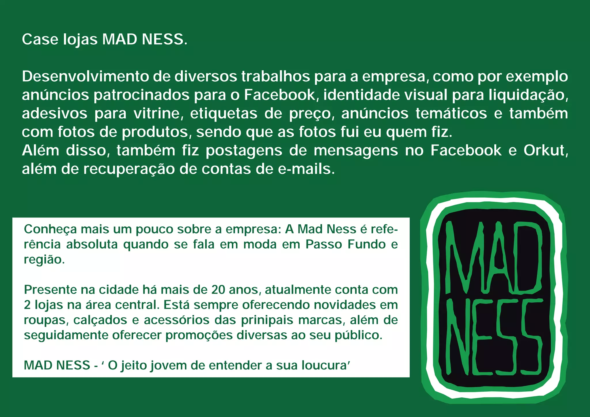 O documento descreve os trabalhos desenvolvidos para a loja de roupas MAD NESS, incluindo anúncios no Facebook e Orkut, identidade visual para liquidação, adesivos para vitrine e etiquetas de preço. A empresa MAD NESS atua há mais de 20 anos em Passo Fundo oferecendo roupas, calçados e acessórios das principais marcas.