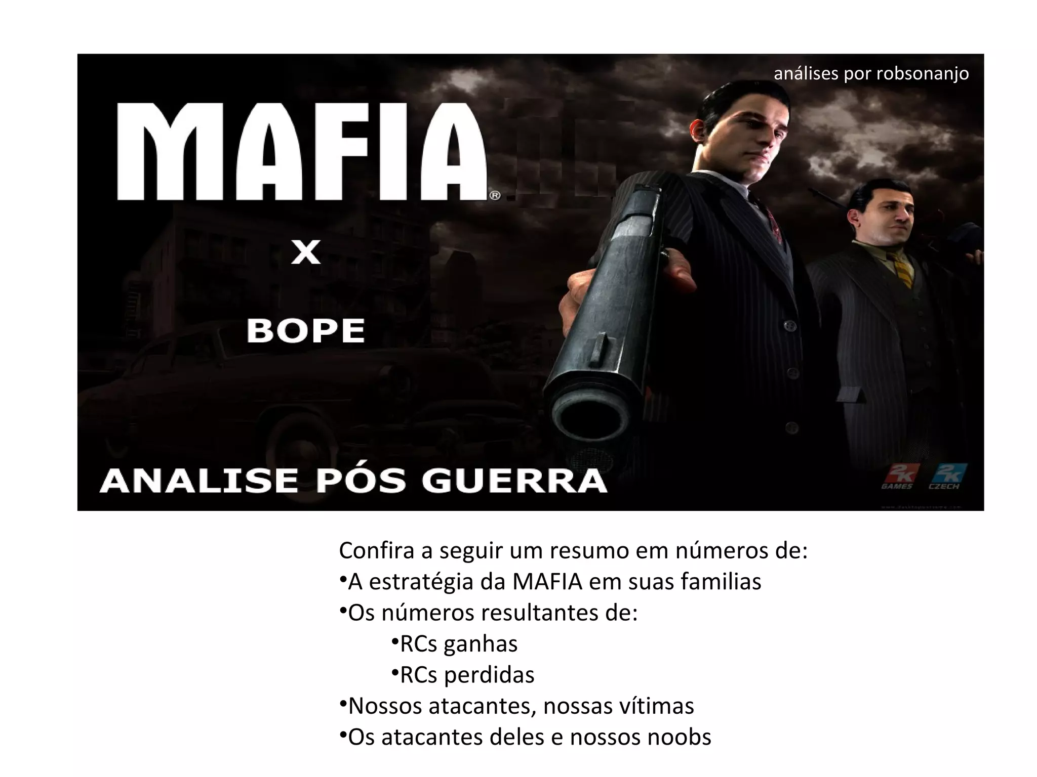 Este documento fornece estatísticas sobre as famílias da máfia, seus aliados e inimigos, com base no número de recompensas conquistadas e perdidas em ataques e defesas. É apresentado o ranking dos principais atacantes e vítimas da máfia, assim como os atacantes da organização rival BOPE que mais causaram danos à máfia.
