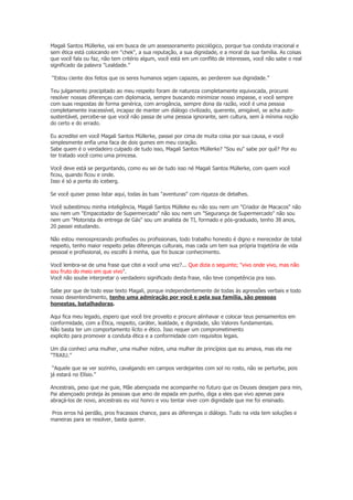 Magali Santos Müllerke está sendo aconselhada a buscar aconselhamento psicológico devido a seu comportamento irracional e falta de ética que estão prejudicando sua reputação e dignidade. O documento descreve as ações inadequadas de Magali e sua incapacidade de manter um diálogo civilizado. Apesar dos problemas, o autor expressa admiração pela família de Magali e deseja que ela reflita sobre valores como ética, respeito e dignidade.