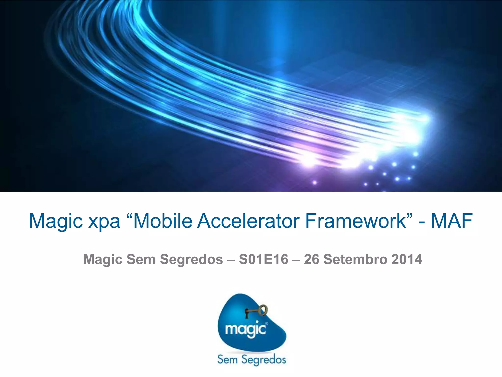 O documento descreve o Magic xpa "Mobile Accelerator Framework" (MAF), uma plataforma de desenvolvimento de aplicativos móveis da Magic Software. O MAF fornece serviços como login, menus, localização, seleção de dados, gráficos e auditoria para simplificar o desenvolvimento de aplicativos móveis corporativos. A Magic Software tem 30 anos de experiência e soluções para desenvolvimento de aplicativos centrados em negócios.