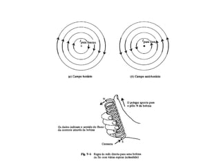 O documento discute conceitos fundamentais de magnetismo e eletromagnetismo, incluindo: