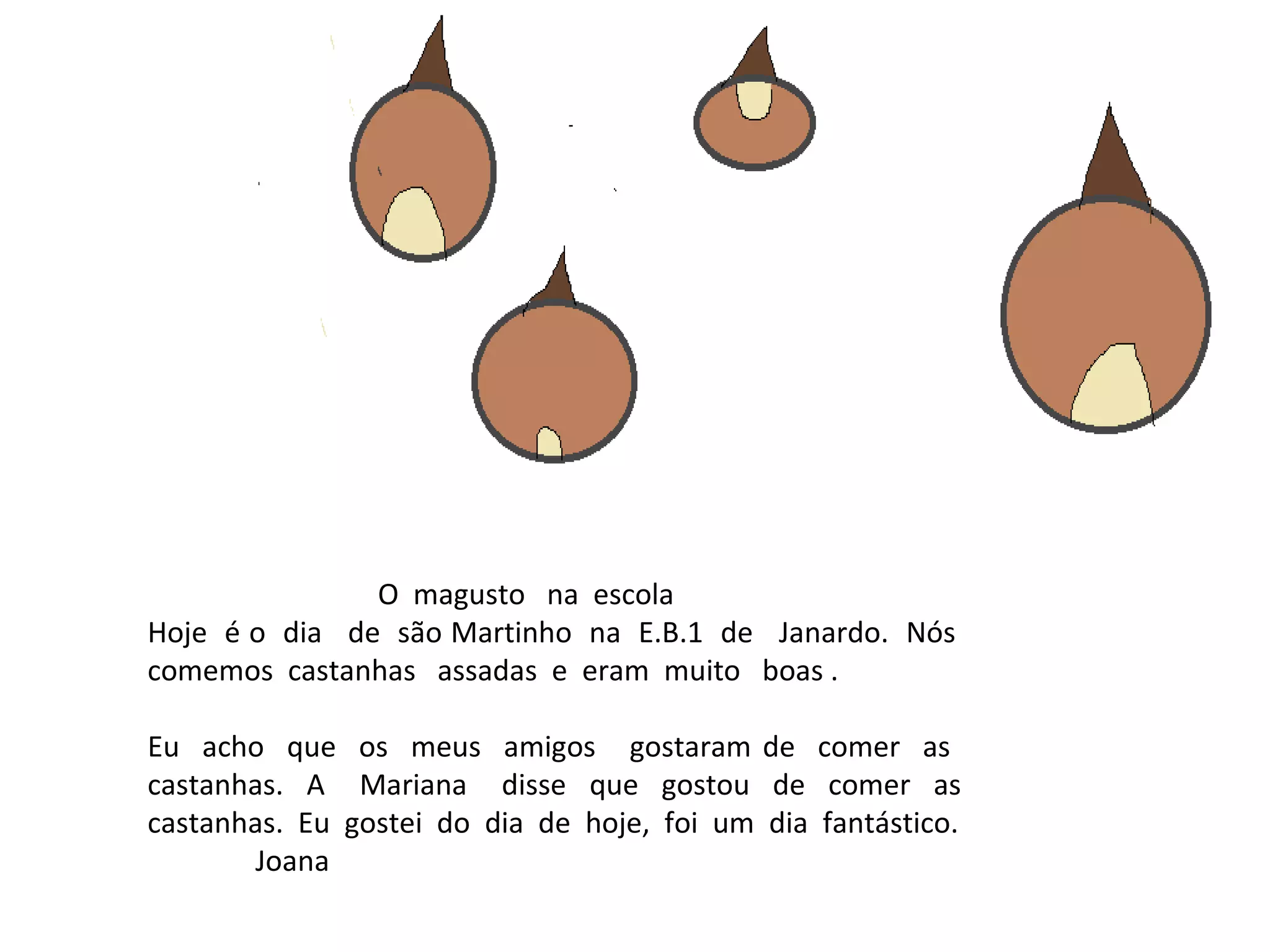 As crianças da escola primária de Janardo celebraram o dia de São Martinho comendo castanhas assadas. Eles desfrutaram das castanhas quentes e a amiga Mariana disse que também gostou delas. Foi um dia divertido para todos.