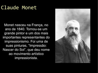 O documento descreve três importantes pintores impressionistas: Claude Monet, nascido na França em 1840 e conhecido por suas pinturas de paisagens e séries sobre a catedral de Rouen; Pierre-Auguste Renoir, nascido em 1841 na França e destacado por suas cores fortes e formas humanas; e Edgar Degas, nascido em 1834 na França e reconhecido por suas pinturas de bailarinas e cenas do cotidiano parisiense.