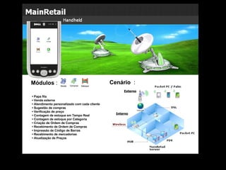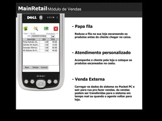 O documento descreve um sistema de gestão de vendas e estoque que visa melhorar o atendimento ao cliente e a eficiência nas operações. Inclui funcionalidades como controle de estoque em tempo real, criação de ordens de compra, e venda externa em dispositivos móveis. A proposta central é maximizar a eficácia das lojas através da tecnologia e conectividade em tempo real.
