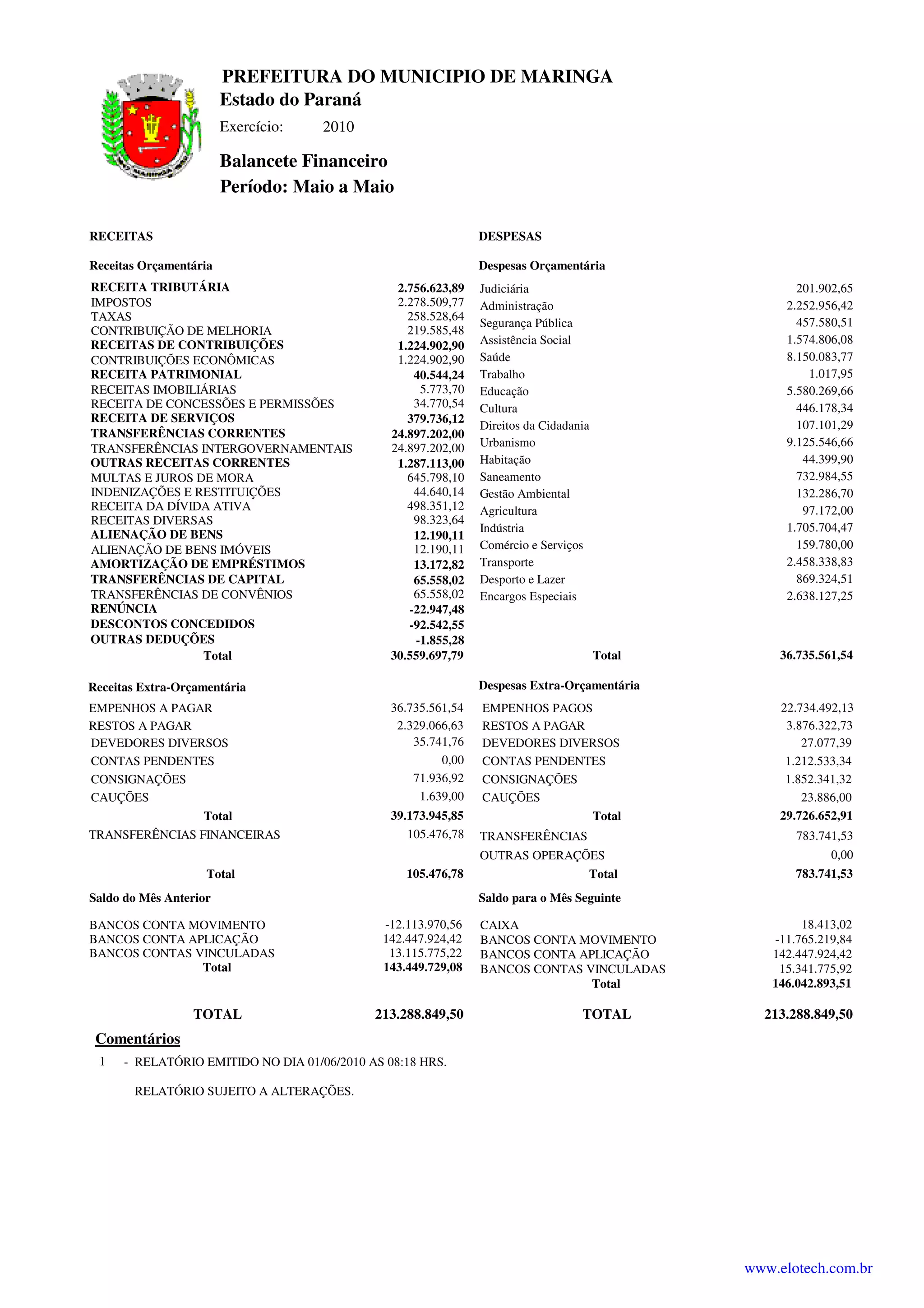 Este documento apresenta o balancete financeiro da Prefeitura de Maringá no período de maio de 2010. Ele mostra as receitas e despesas orçamentárias e extra-orçamentárias da prefeitura, incluindo transferências, empenhos, restos a pagar e saldos bancários. As receitas vieram principalmente de impostos, contribuições econômicas e transferências intergovernamentais, enquanto as maiores despesas foram com saúde, educação e urbanismo.
