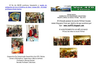 O documento resume os eventos do mês de maio na Escola Fátima, incluindo o lançamento do livro "A Didática do Amor", volume III e o aniversário de 56 anos da escola no dia 13 de maio, que contou com apresentações de alunos e uma visita. Estagiárias da PUC conversaram com os alunos sobre saúde, alimentação e sexualidade.